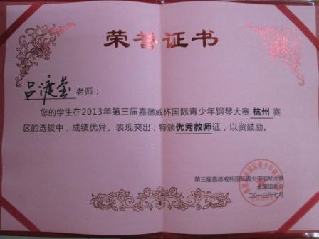 2013年暑假,国泰学校吕渡莹老师组织学生在2013年第三届嘉德威杯国际青少年钢琴大赛杭州赛区的选拔中,成绩优异,表现突出,荣获“优秀教师”称号。